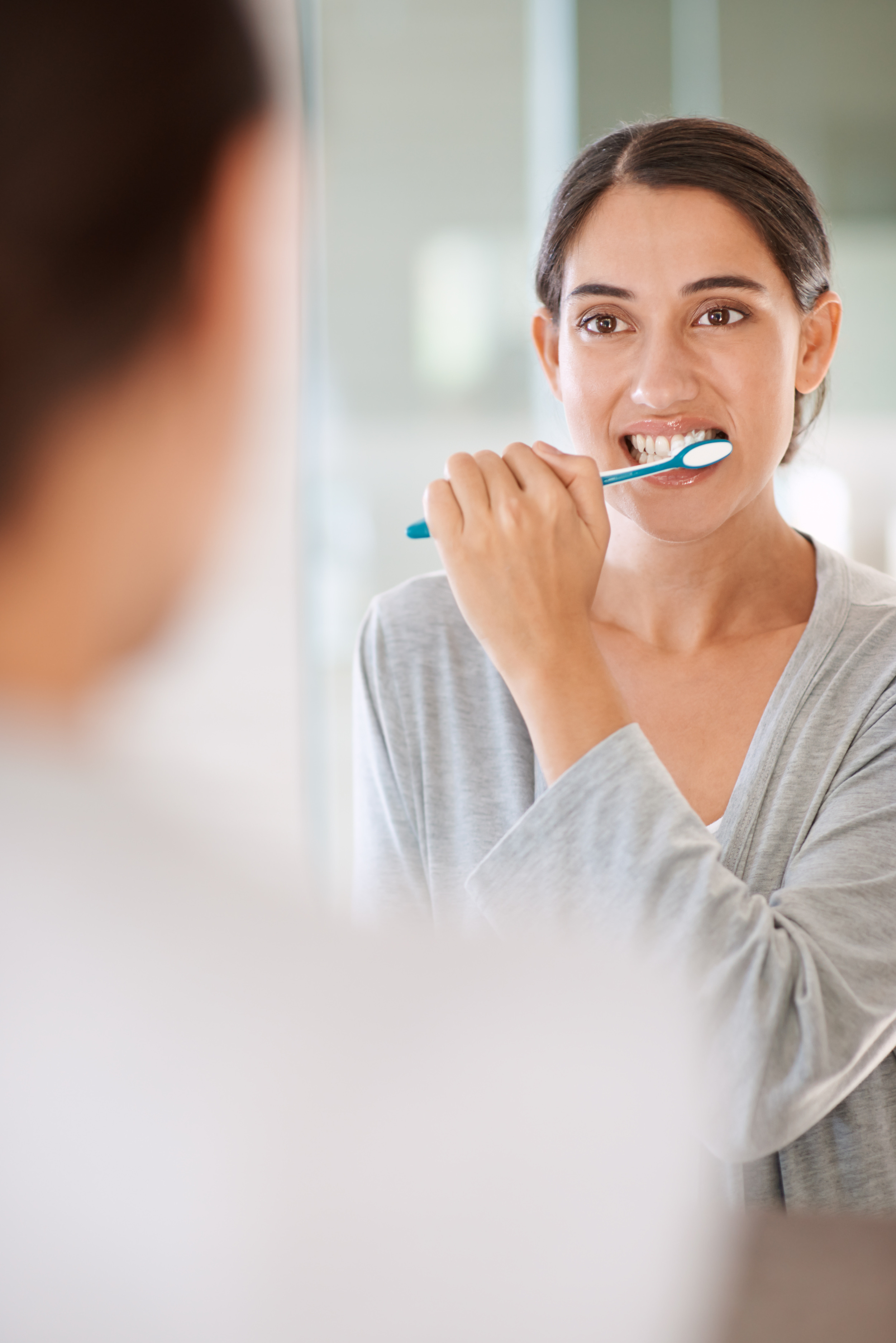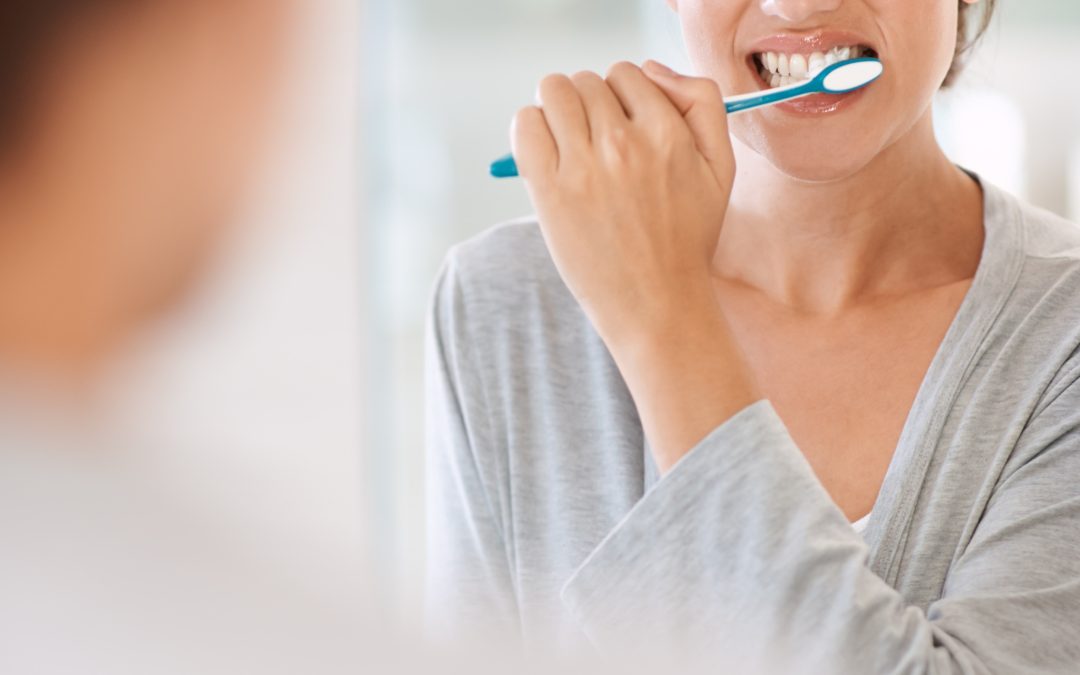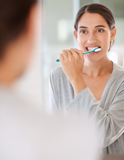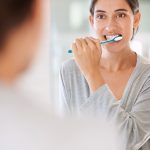 woman-brushing-teeth-smile-home-by-mirror-health-wellness-self-care-breath-mo...